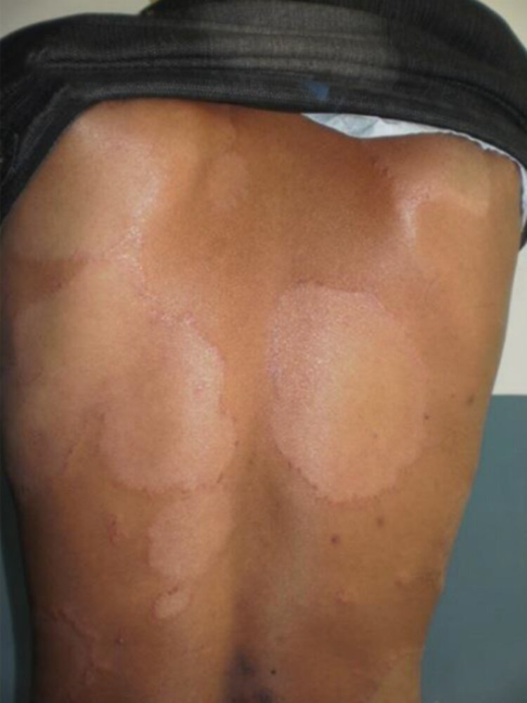 - Few (usually 1–3 lesions), localized, hypopigmented macules, plaques, and/or papules with well-defined, erythematous, and/or raised margins