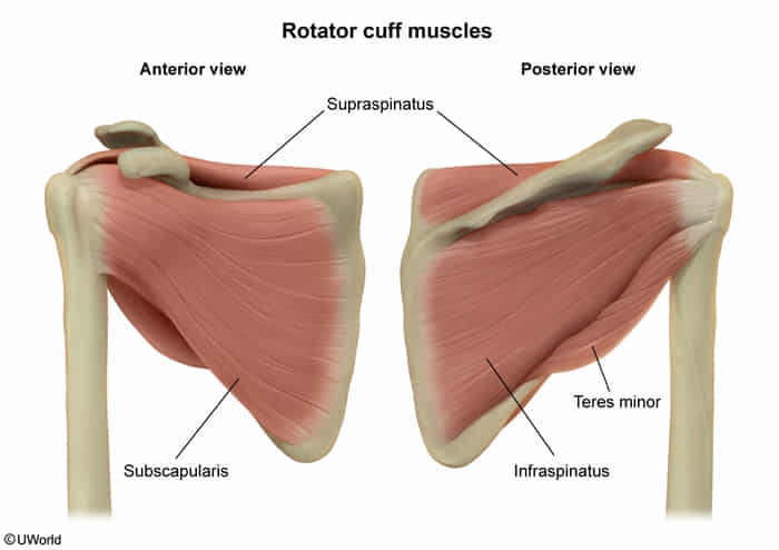 - Most common rotator cuff injury (trauma or degeneration and impingement leading to tendinopathy or tear)