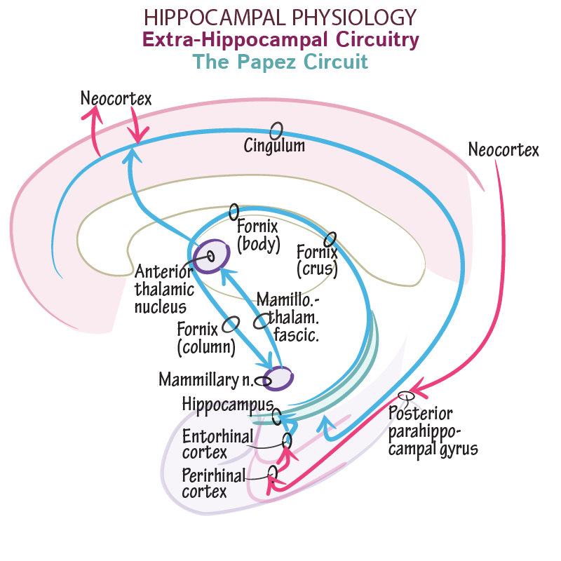 - Pathway: Hippocampus → Fornix → Mammillary Bodies → Mammillothalamic Tract → Anterior Nucleus of the Thalamus → Cingulate Gyrus → Entorhinal Cortex → Hippocampus.