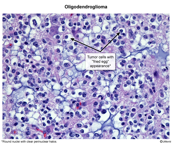 - Oligodendroglioma: “Fried-egg” cells, “chicken-wire” capillaries, often calcified.