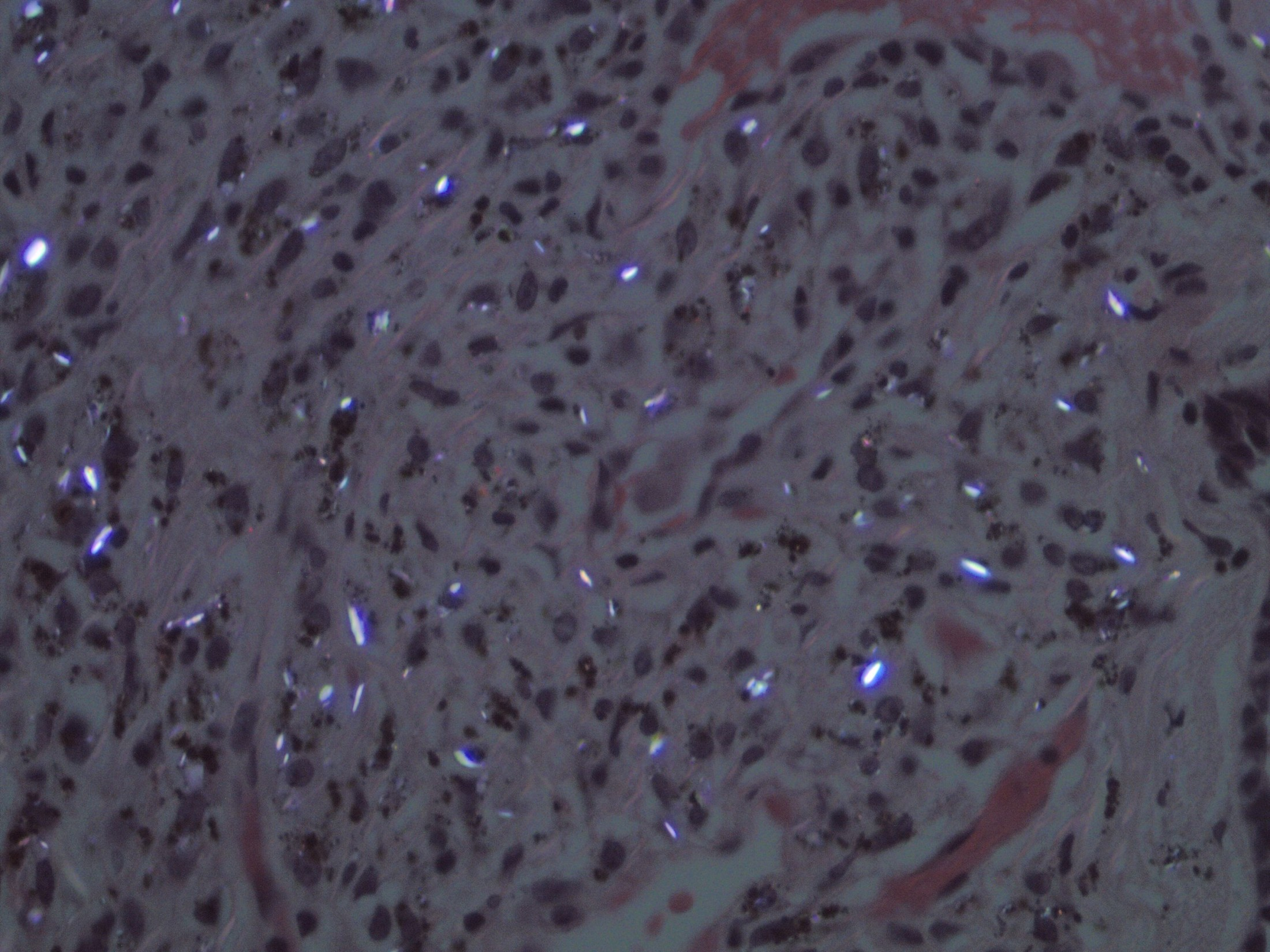 - Biopsy: silicotic nodules, characterized by weakly birefringent silica particles in a central hyalinized region surrounded by concentric “onion-skin” collagen fibers