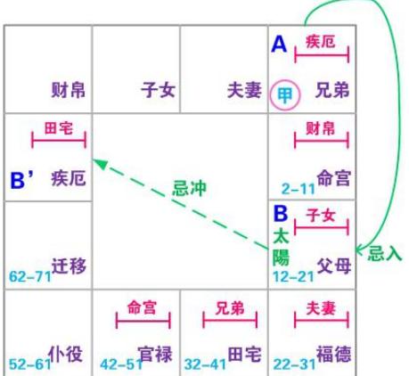 假若夫妻宫的癸干化忌入的是子女宫。同样符合断命诀的条件。夫妻宫是六亲 宫是人位,子女宫同样是六亲宫也是人位。这样的解象叫做我的配偶喜欢管束 我的子女。所以星辰所扮演的角色功能就是导气于何方。导这 个爱管束的气是从夫妻宫落在子女宫,叫做我的配偶喜欢管束 我的子女。假若贪狼星落在命宫的时候,夫妻宫的化忌不是落 在子女,是落在命宫的时候,代表我的配偶喜欢管束我。