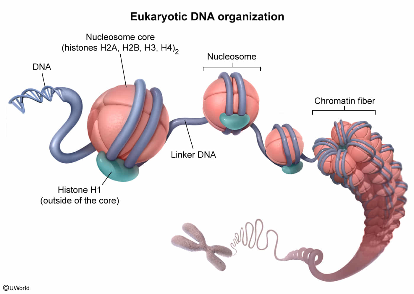- Histone H1 (Linker): Binds to the nucleosome and “linker DNA” to stabilize the chromatin fiber. It is outside the core octamer. t