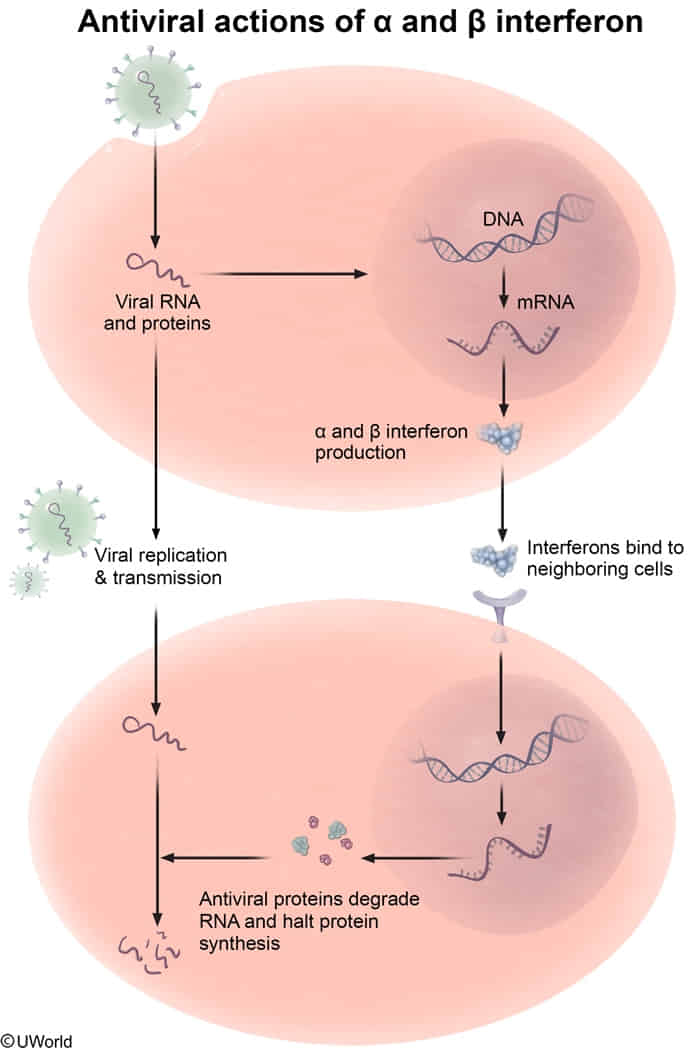 - Inhibits viral protein synthesis by activating ribonuclease L, leading to the degradation of cellular and viral mRNA