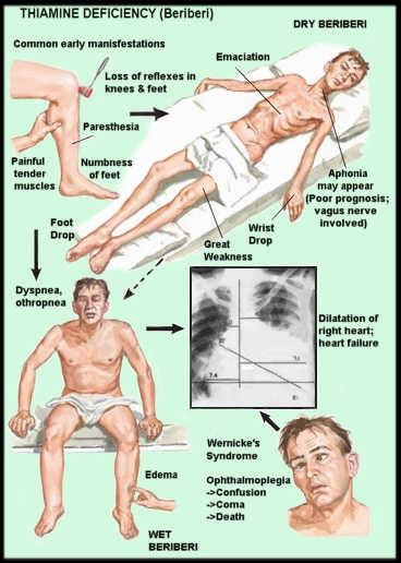 - Beriberi (脚气病): inadequate thiamine uptake due to malnutrition, heavy drinking, or increased demand (e.g., hyperthyroidism, pregnancy)