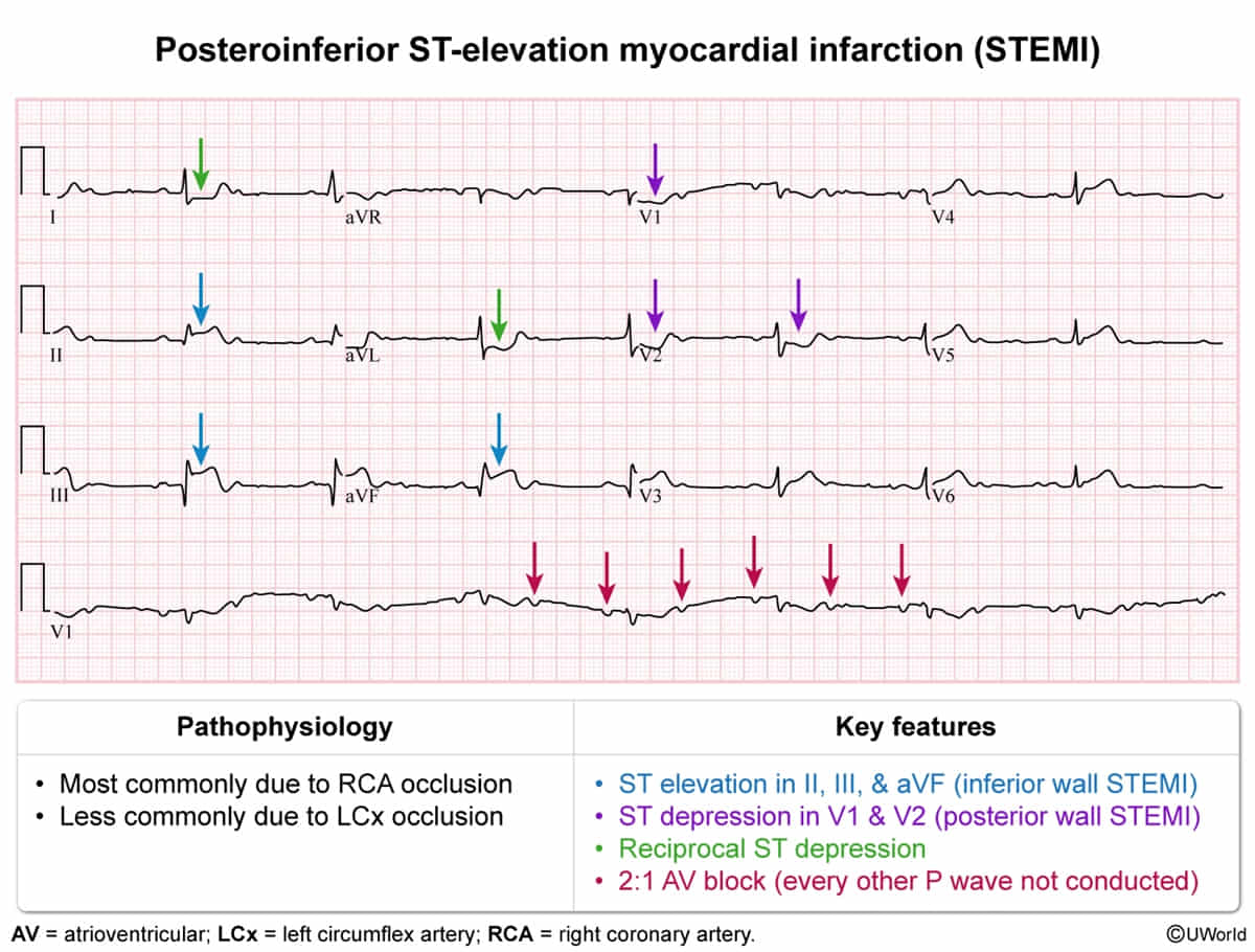 - Classic finding: Persistent ST-segment elevation and deep Q waves in the leads of the previous MI (usually anterior leads V1-V4), weeks after the initial event. c