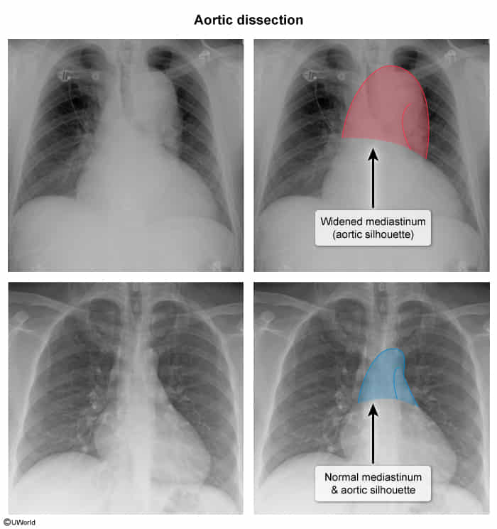 Chest X-ray (CXR): Often the first imaging study; may show a widened mediastinum (>8 cm).
