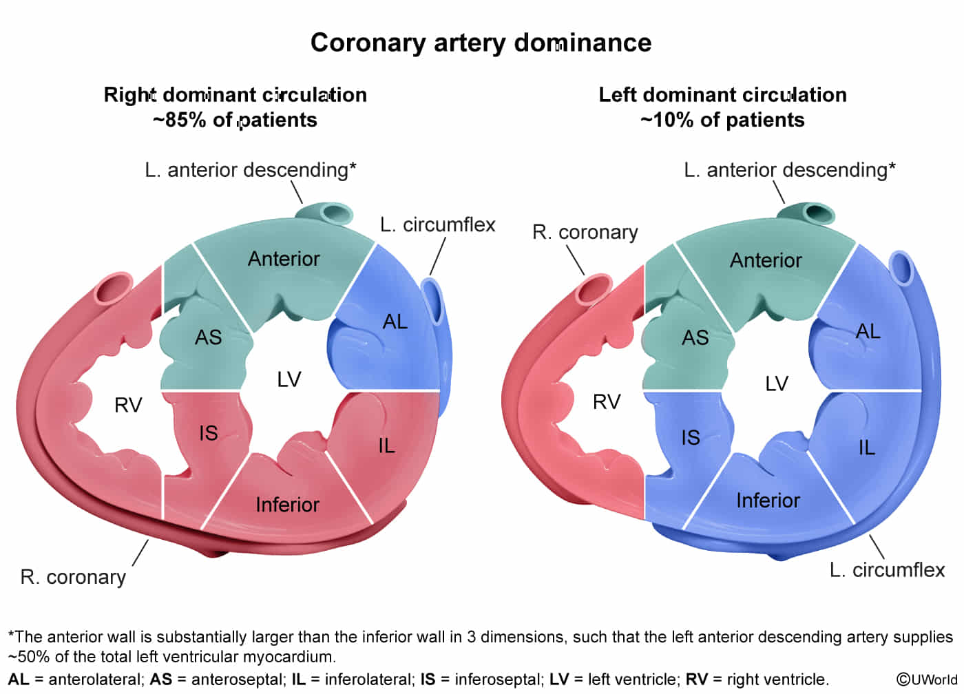 - Dominance = which artery gives rise to PDA and supplies AV node, inferior/posterior LV walls, posterior septum