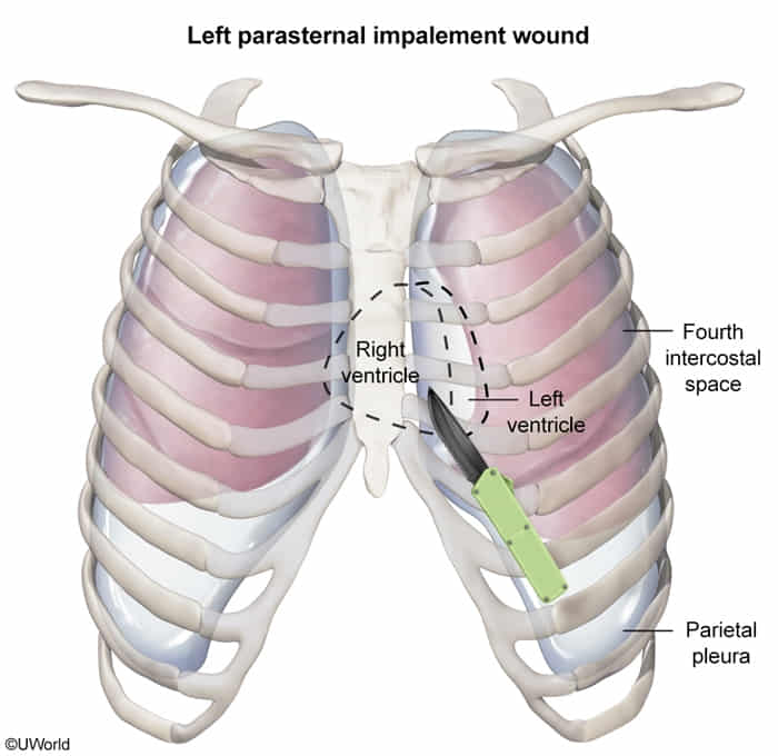 Penetrating chest trauma Right Ventricle Site: Left sternal border (3rd–5th ICS). Note: Most anterior chamber; #1 injured in cardiac stab wounds.