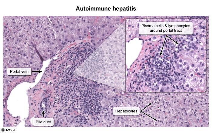 - Type 1 AIH (80% of cases): characteristic autoantibodies include antinuclear antibodies (ANAs), anti-smooth muscle antibodies (ASMAs) anti-soluble liver antigen antibodies (anti-SLA)