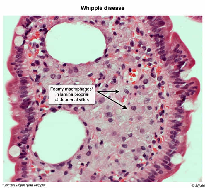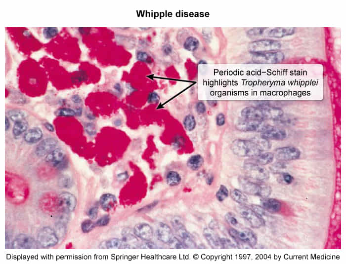 - Small intestine biopsies: detection of PAS-positive foamy macrophages in the lamina propria
