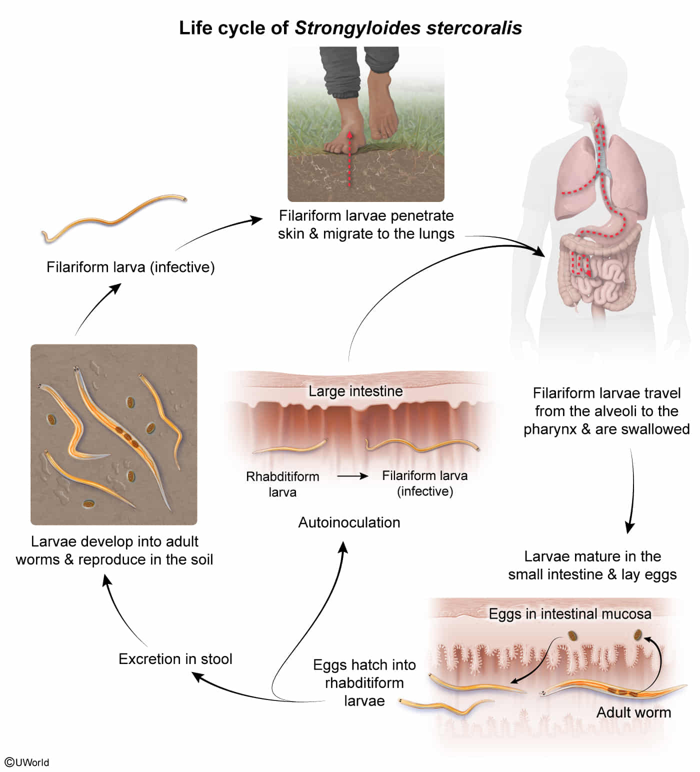 The Strongyloides eggs hatch in the human intestine and release larvae→ larvae are excreted in feces and contaminate the soil→ larvae penetrate the intact skin of the definitive host upon contact with contaminated soil → larvae migrate to the lungs via the bloodstream → larvae migrate to the pharynx via the alveoli and bronchial system → larvae are swallowed, causing autoinfection → larvae mature into adult, egg-producing worms in the intestine → eggs develop into infectious larvae and are excreted in feces
