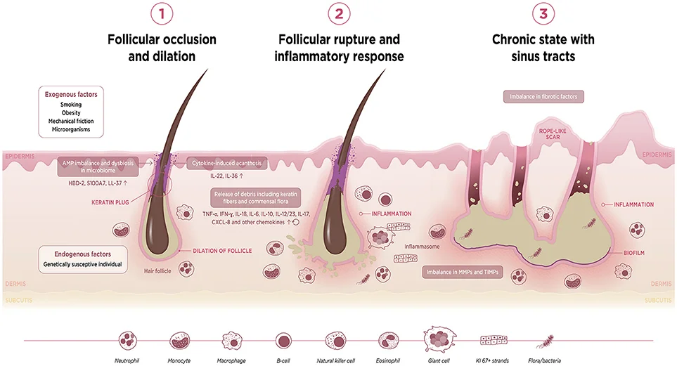 - Follicular occlusion (keratin plug) in apocrine-bearing skin (axilla, groin); NOT primarily infectious.