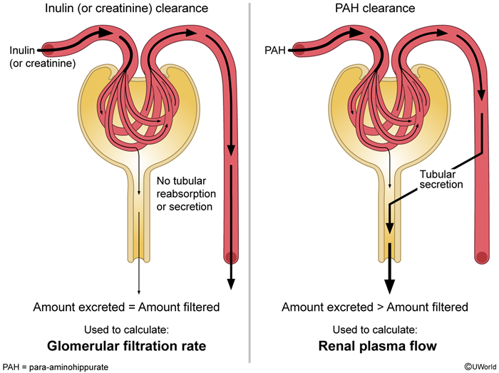 - GFR can be calculated using the inulin or creatinine clearance, as these substances are freely filtered at the glomerulus and have relatively insignificant tubular reabsorption or secretion. RPF can be determined using the para-aminohippuric acid (PAH) clearance as almost all the PAH entering the kidneys is excreted in the urine (mostly via tubular secretion).