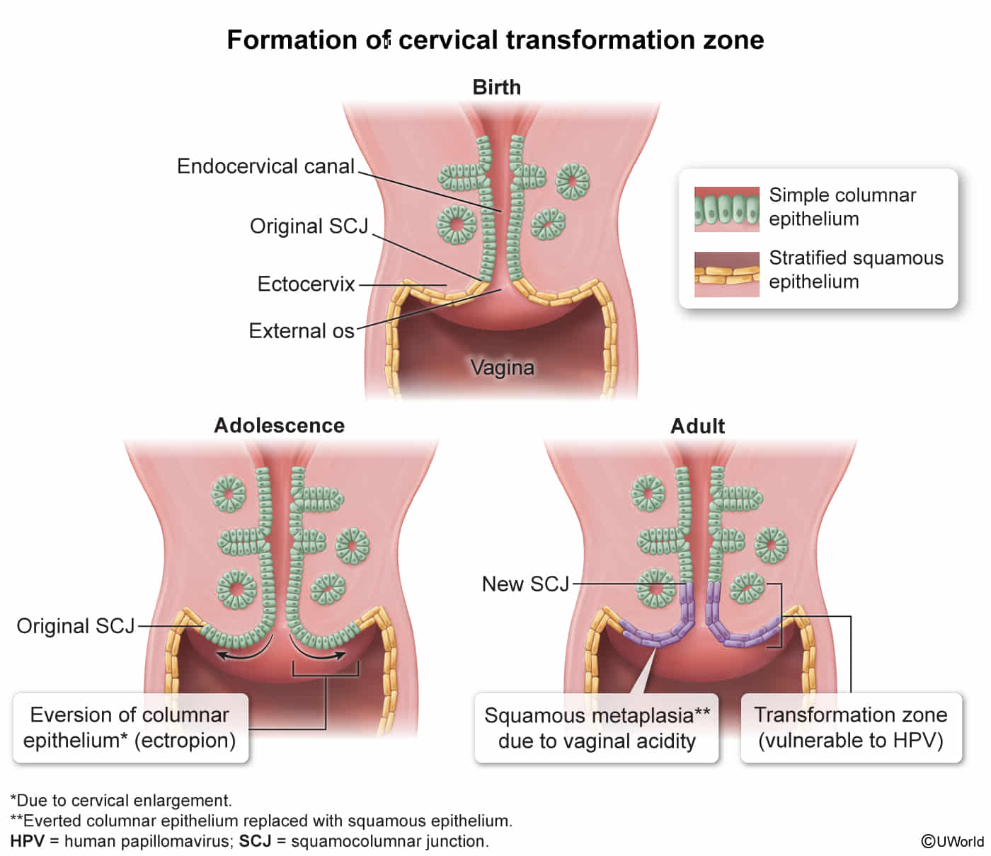 - Squamocolumnar Junction (SCJ): The sharp boundary where the squamous and columnar epithelia meet.