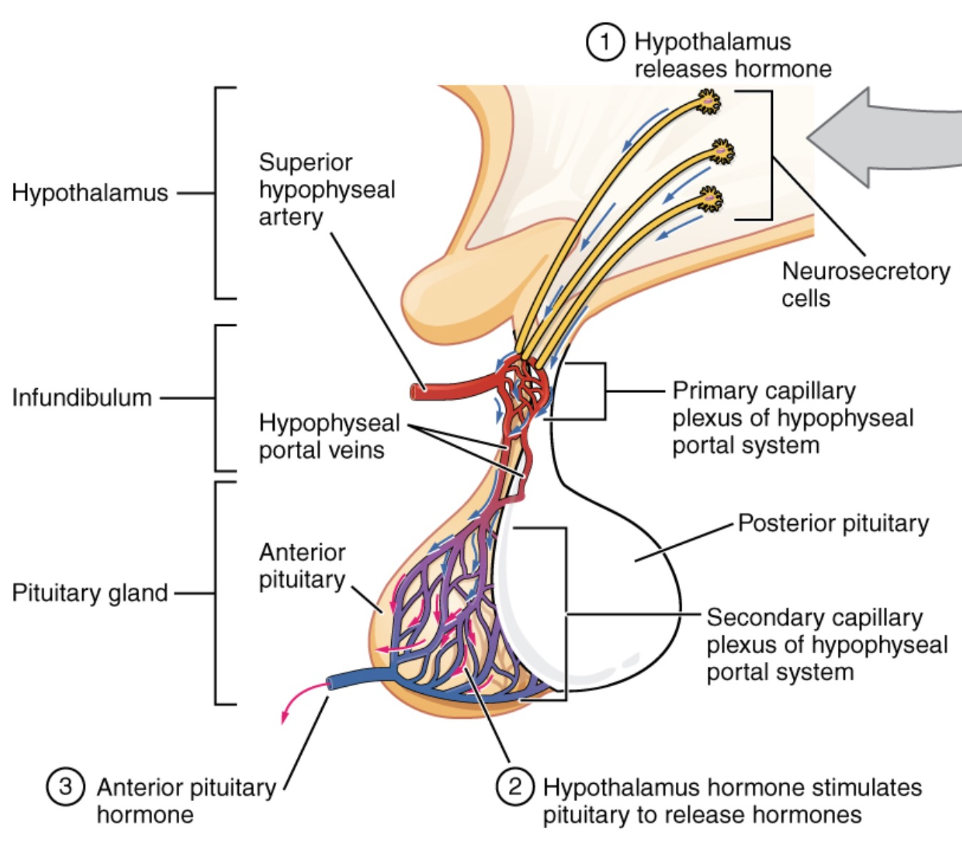 - Anterior Pituitary (Adenohypophysis): Derived from Rathke’s pouch (oral ectoderm). Receives blood from the hypothalamo-hypophyseal portal system.