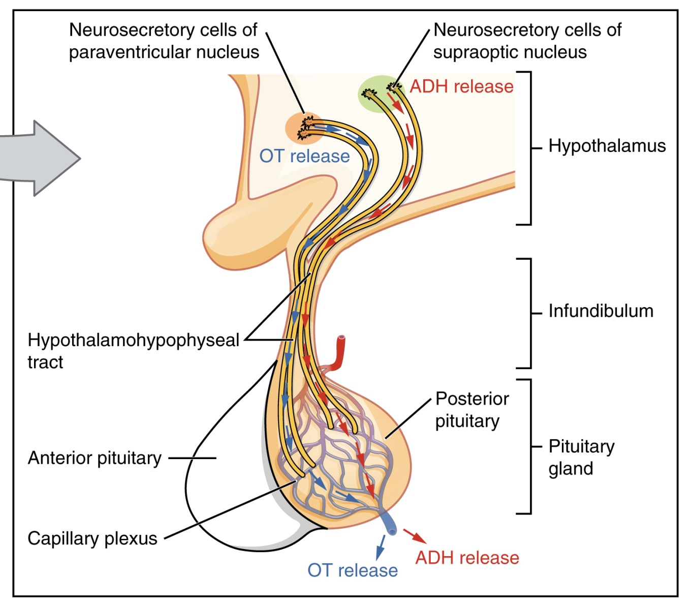 - Posterior Pituitary (Neurohypophysis): Derived from neuroectoderm. Contains axon terminals from the hypothalamus.