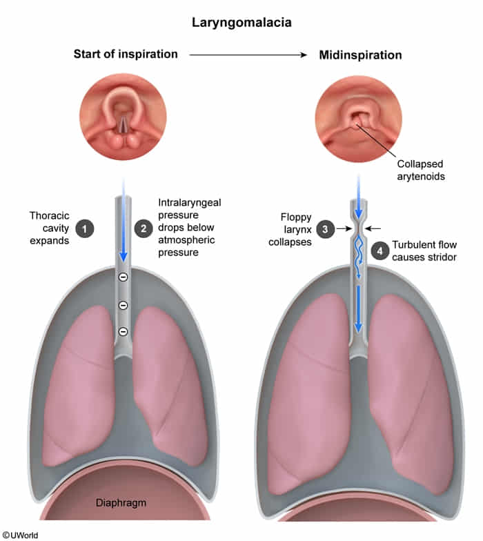 - Tracheomalacia: Diff by expiratory stridor; intrathoracic airway collapse. Worsens w/ forced expiration (crying, coughing).