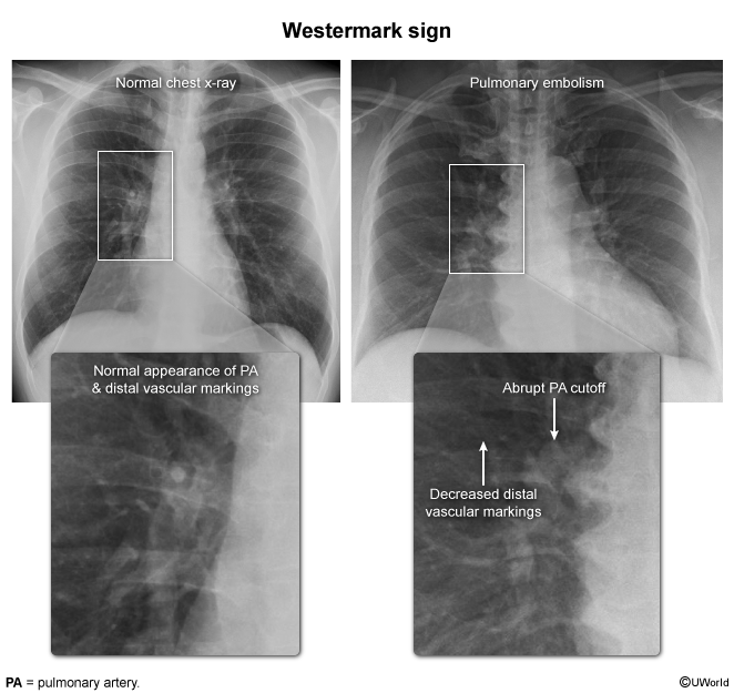 - CXR: Usually normal. Rare signs: Hampton Hump (wedge opacity), Westermark Sign (oligemia).