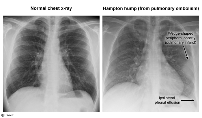- Clinically, it presents with pleuritic chest pain and hemoptysis. Radiologically, it may appear as a wedge-shaped infiltrate (Hampton’s Hump).
